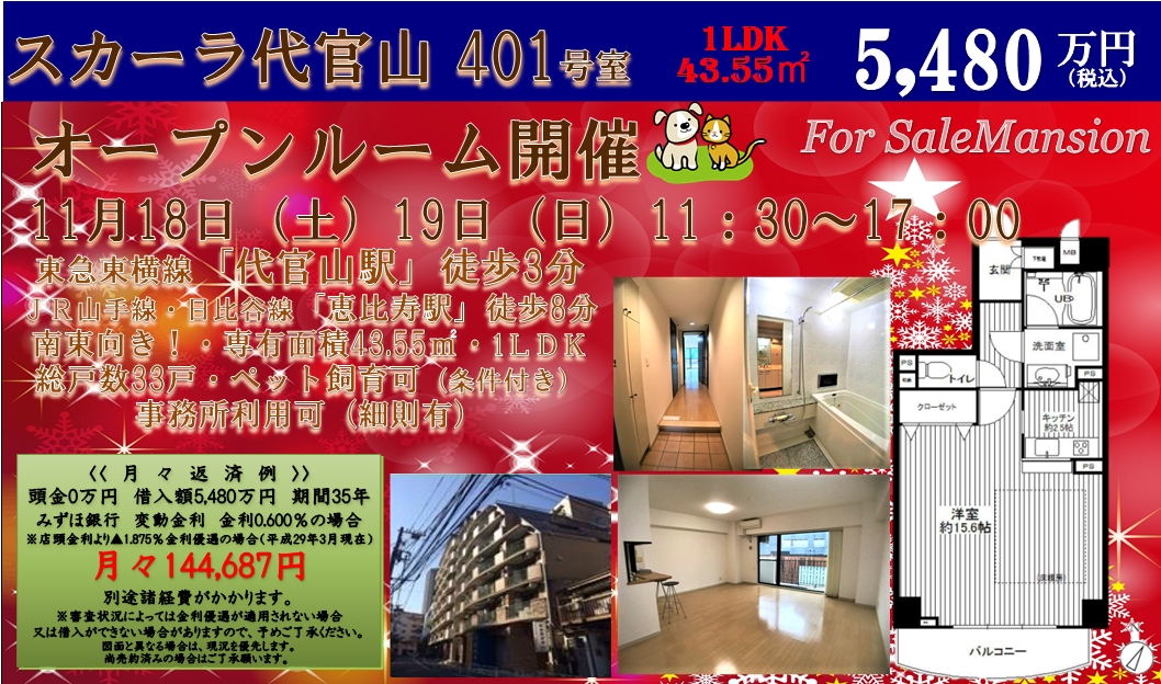 スカーラ代官山401号室【仲介手数料50%OFF】 11月11日(土)・12日(日)オープンルーム開催いたします